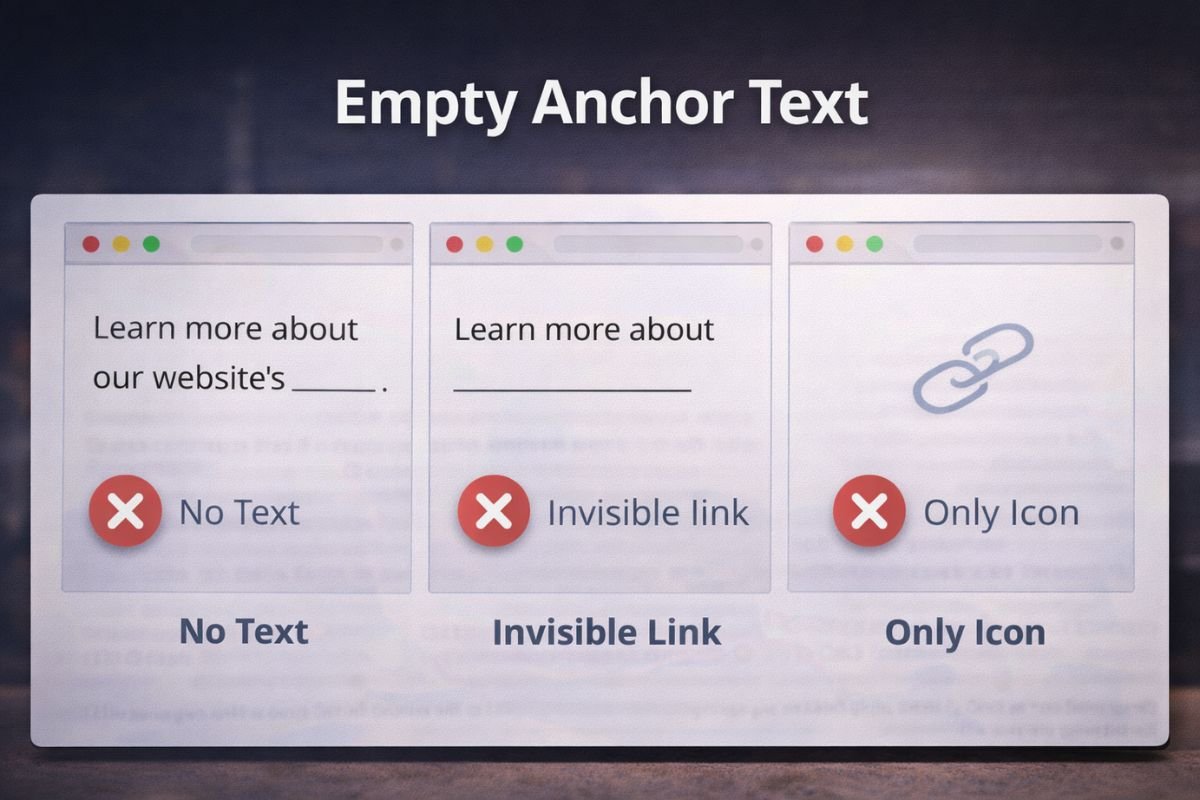 Empty anchor text refers to links that contain no visible text inside the anchor element. Instead of a word or phrase acting as the clickable part of the link, the anchor may contain an icon, a button, or no readable content at all.