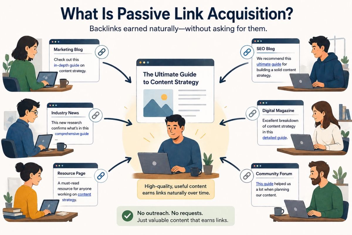 Passive link acquisition is a process where a site gets backlinks without asking for them. The link is not requested; rather, it occurs naturally because the site’s content is being used.